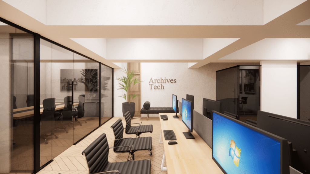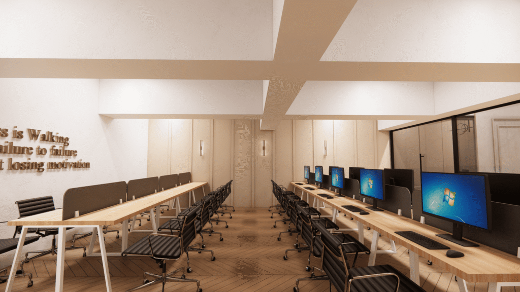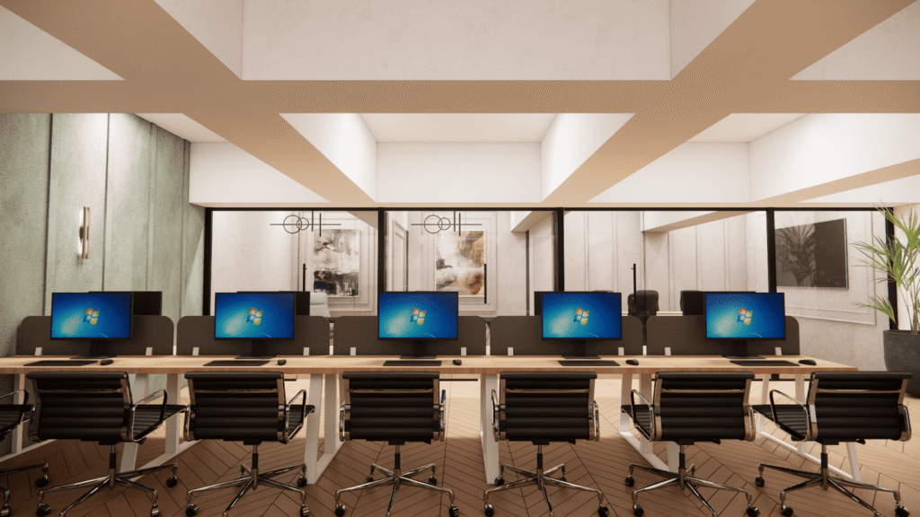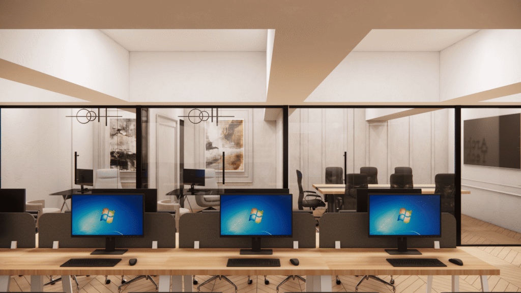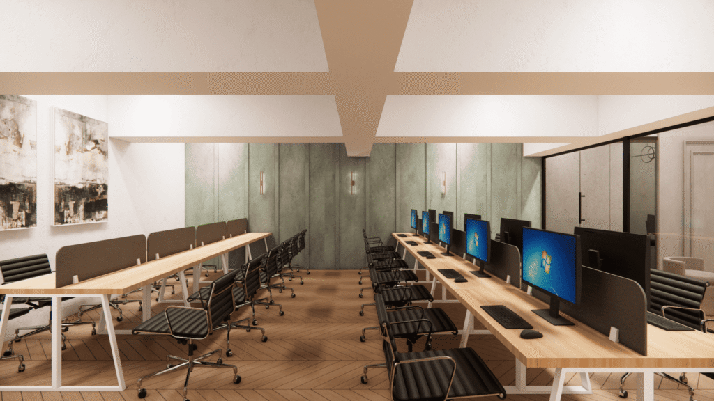 The beams, rather than being hidden, were integrated into the spatial rhythm of the ceiling, creating framed zones that guide circulation and help define work areas without heavy partitions. By working with the structure, the design maintains visual continuity while avoiding a cramped feeling.