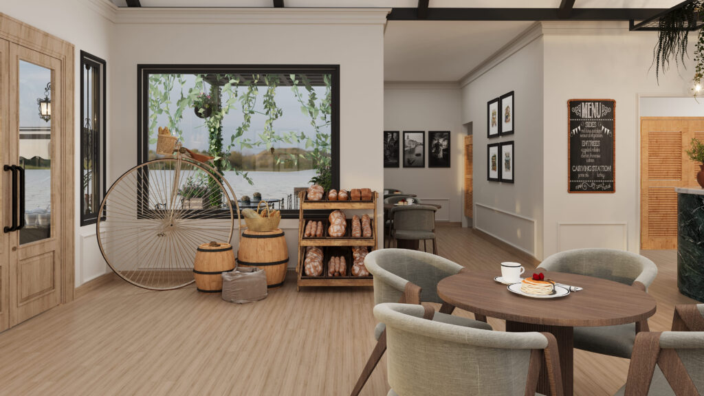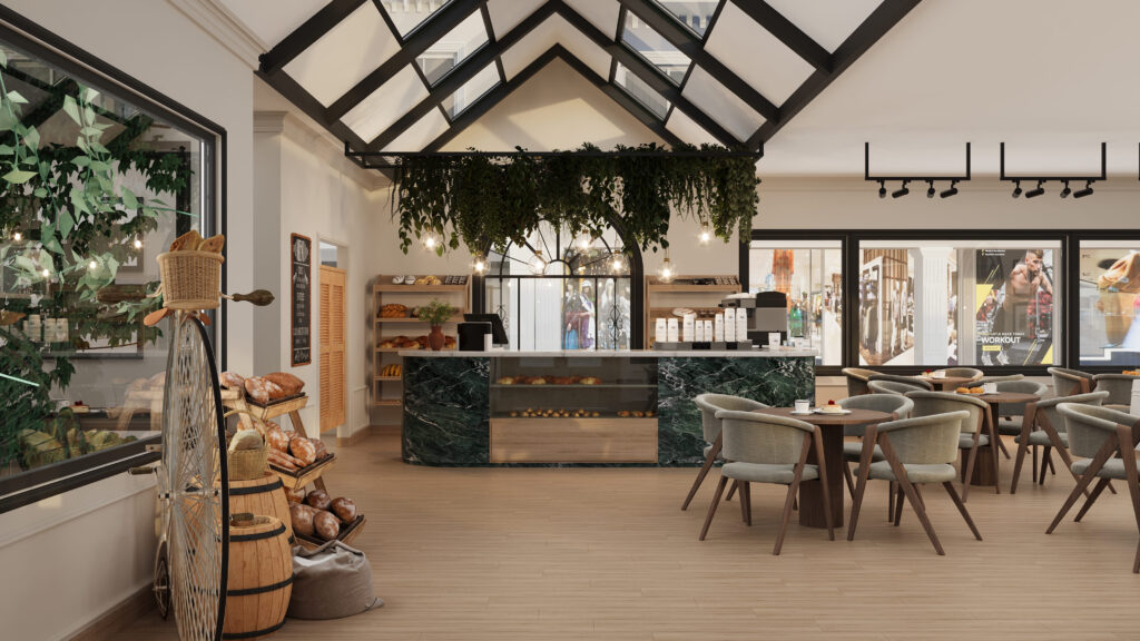 The interiors emphasized craft through tactile, natural materials. A green marble counter anchored the space as a focal point, while hanging greenery under the pitched roof added depth and freshness. Vintage accents—such as the antique bicycle, rustic barrels, and bread displays—were layered thoughtfully with modern furniture, ensuring both character and comfort.