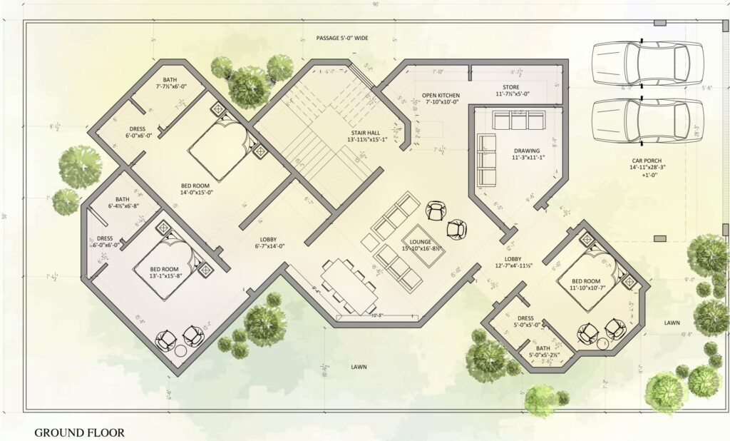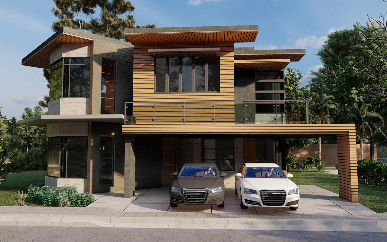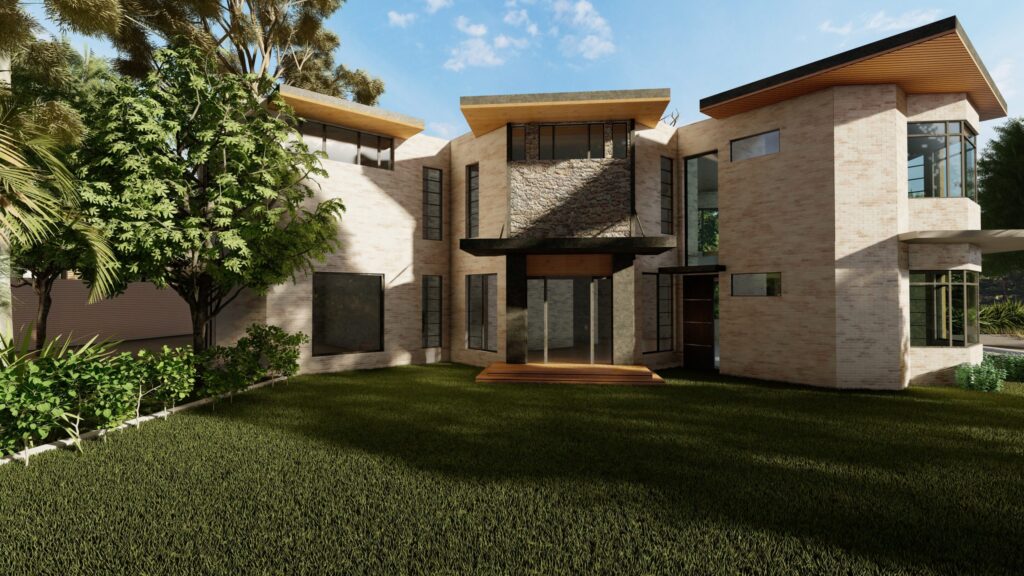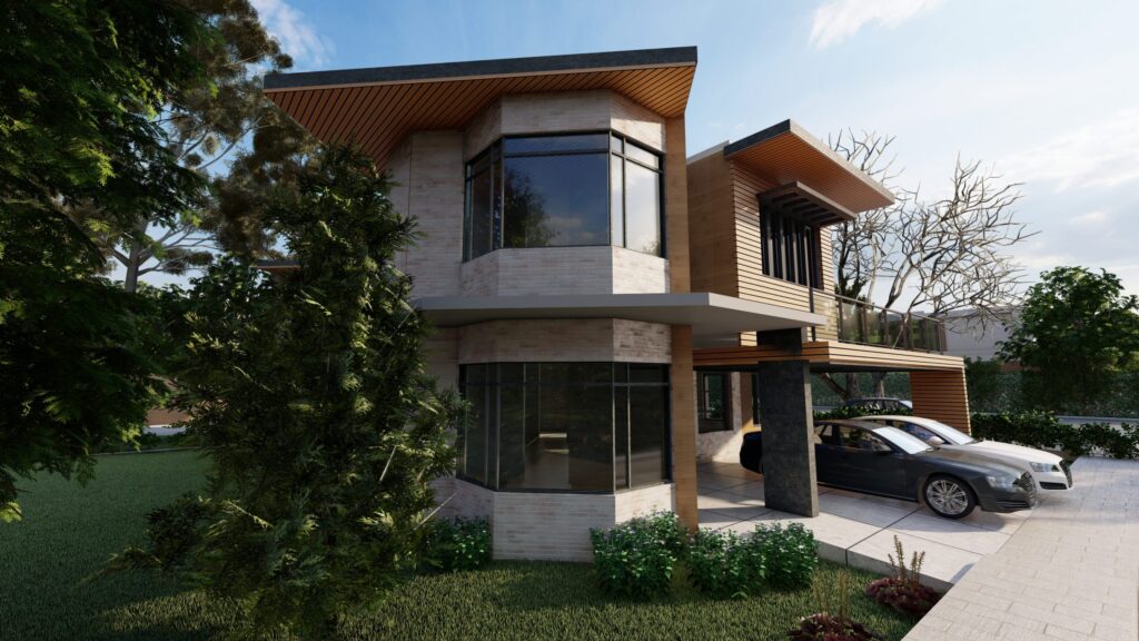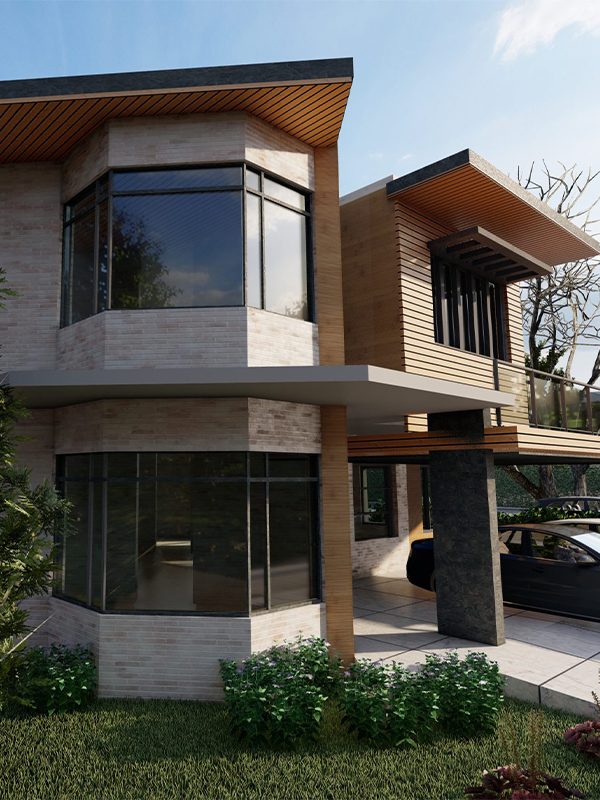 Welcome to our contemporary residential house. It is a 1 Kanal house, designed with the needs of a family of five in mind, in Islamabad. Our architectural masterpiece seamlessly blends communal and private spaces, all of which open up to lush green landscapes, creating a harmonious connection with nature. Every room boasts bay windows that invite you to immerse yourself in the wonders of our vibrant green oasis. The design language exudes modernity, incorporating a blend of bricks, metal, wood, and glass to create a visually stunning and functional dwelling.
